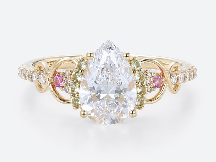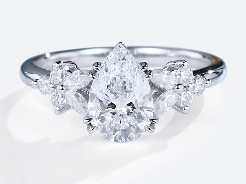White Gold Pear Shaped Lab Diamond Ring with Petal Side Stones