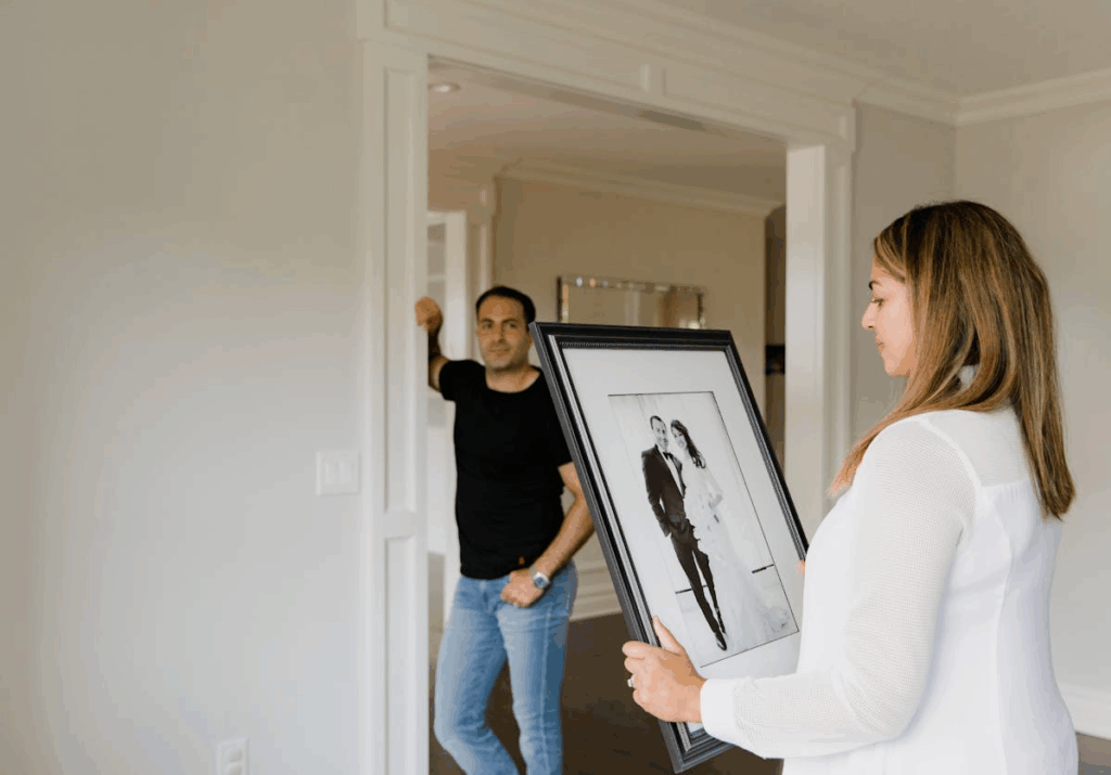 There are a lot of ways to go about hanging your photos, one popular example is a photowall. When it comes to photowalls, it’s important to think of the balance. If every piece relates to the wedding, the wall gets heavy. Drop in neutral art to breathe. Minimal abstracts, calm landscapes or monochrome architectural posters from Desenio can stabilize color and mood.