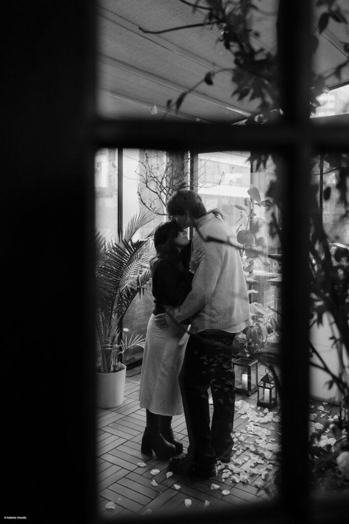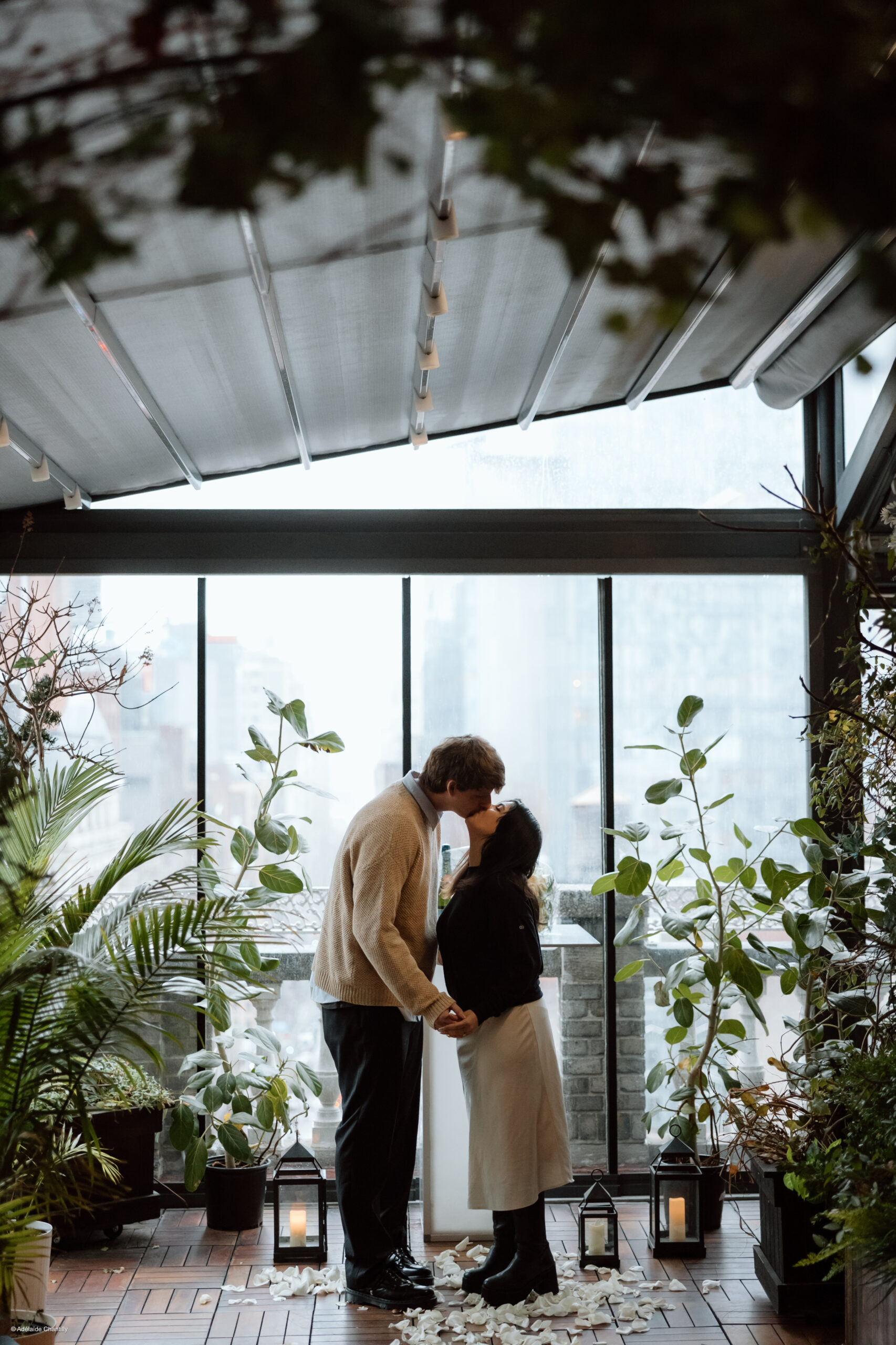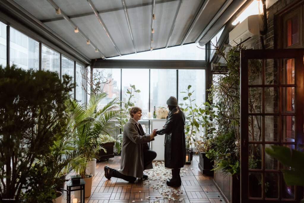 Tucked away inside Midtown Lofts on a rainy New York City day, this proposal felt cozy, intimate, and effortlessly romantic. Soft candlelight, lush greenery, and rose petals transformed the space into a warm escape from the misty skyline outside. Proof that even on a rainy day, NYC proposals can be nothing short of magical.