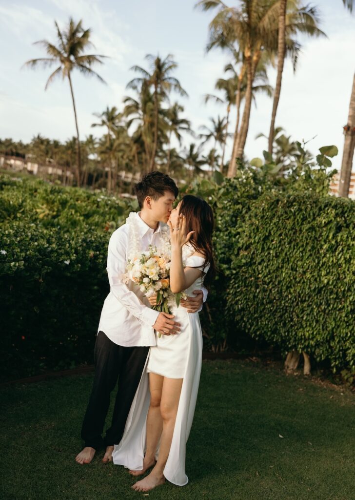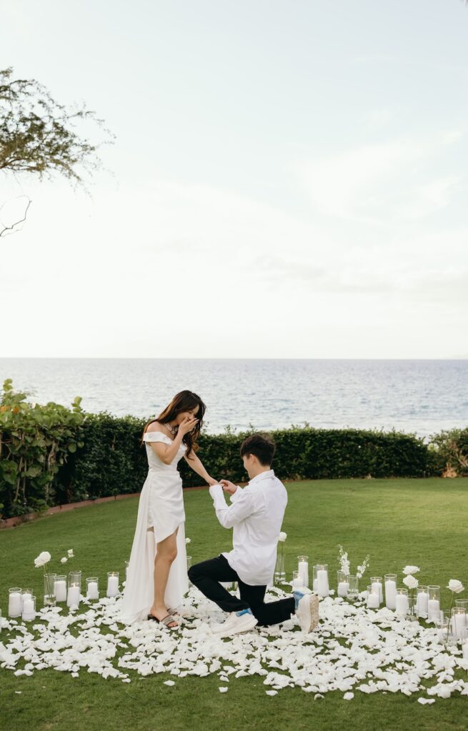 As the sun dipped low over the ocean at Grand Wailea’s Molokini Bluff, this Maui proposal unfolded in the most breathtaking way. Surrounded by swaying palms, soft florals, and candlelight against the golden shoreline, the moment felt intimate, serene, and endlessly romantic. A true island dream come to life at sunset.
