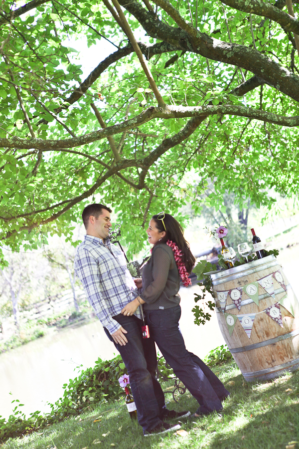 Rob and Lauren arrived at Sullivan Winery in Napa for their first wine tasting. It was the perfect location, breathtaking and intimate. Photographer, Sara and I were already at a table as if just two ordinary friends enjoying a wine tasting which was in fact our perfect set up to capture photos of the couple without Lauren knowing. The wonderful staff (in on the entire surprise) poured the couple’s first tasting but didn’t leave it at that. A “complimentary” lei was also brought out with the tasting. Thinking the winery was just extremely nice she put on her pink lei not realizing quite yet it was her first gift of many, the one that represented their first date. From then on, she receive a small, fairly random item with each wine tasting. Soon she would know the significance and each gift was hand picked by her soon-to-be fiance to share recognize moments in their relationship.