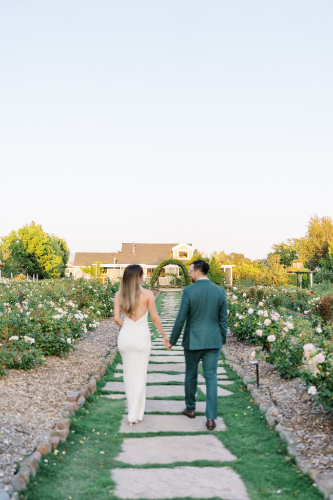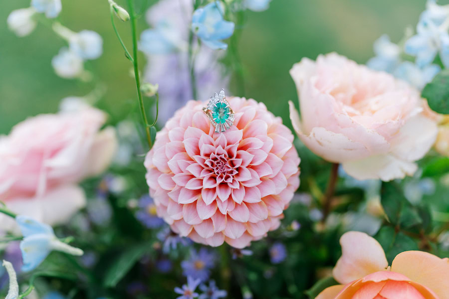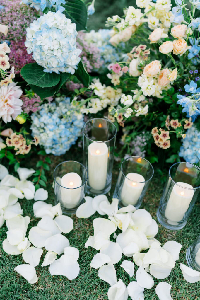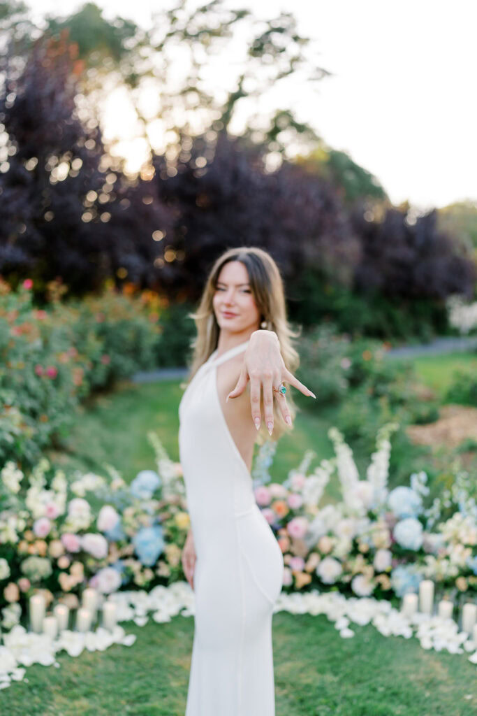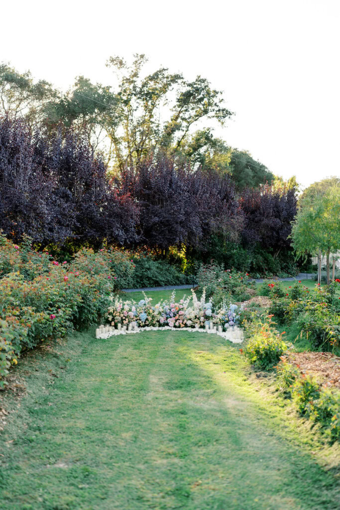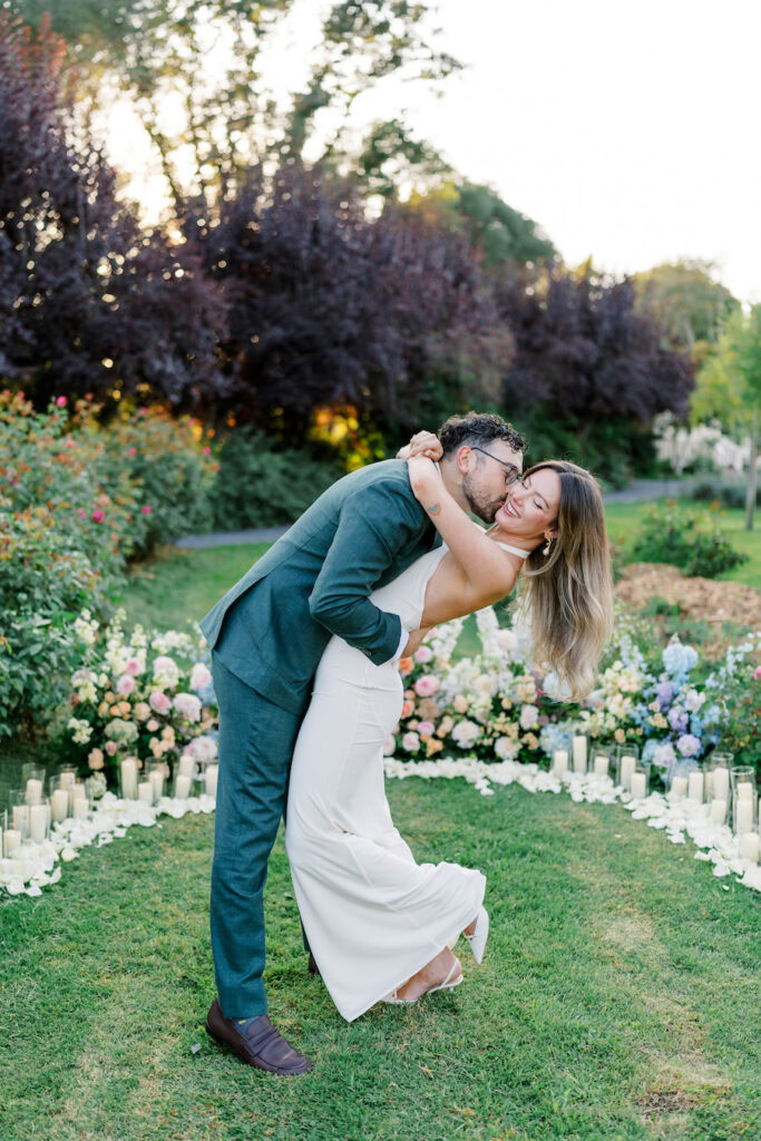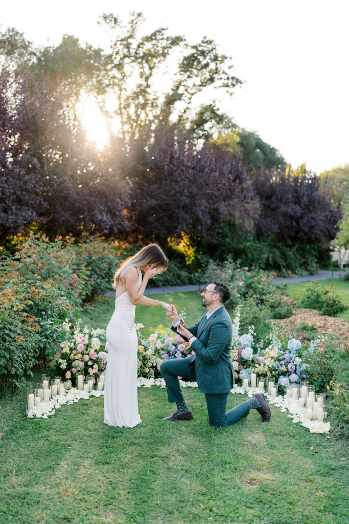 He told his soon-to-be fiancée that he had scheduled a private wine tasting at a Napa winery, but little did she know that wasn’t the real surprise. Instead, nestled in a stunning garden filled with lush greenery, he had arranged her dream proposal. The moment she stepped into the space, her eyes were met with a grounded floral arch in pastel rainbow hues, flickering candles, and the man she loves waiting on one knee.