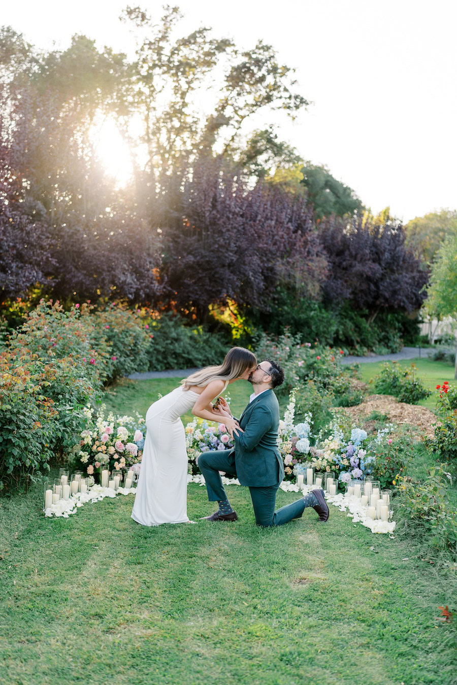 When he got down on one knee, her reaction was pure joy. Overcome with emotion, she laughed, cried, and kissed him through happy tears. It was the kind of moment you dream of—a luxury Napa garden proposal filled with love, intentional details, and a storybook setting. For the special moment, she wore a timeless white satin gown. It added a touch of effortless bridal elegance, making her look radiant as she said “yes.” The scene was nothing short of cinematic—candles glowing, flowers blooming, and golden Napa sunlight streaming through the garden.