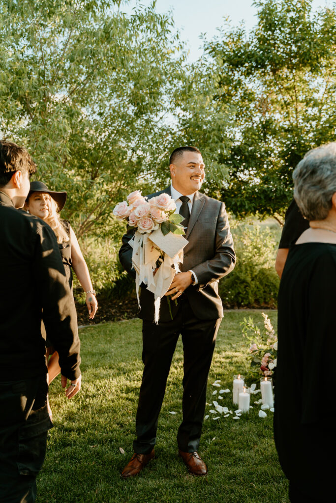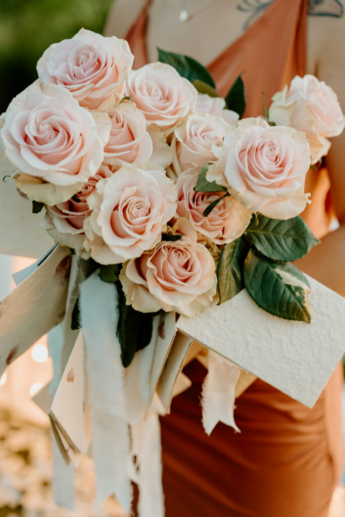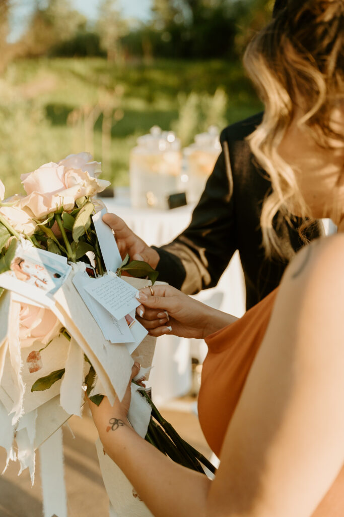 Each family member hand-wrote their own note to Breanna, with well wishes for their engagement and everlasting love. They lined up to greet the couple so they could hand off these flowers and notes one by one. As she greeted each person her bouquet of pink roses and letters grew bigger and bigger!