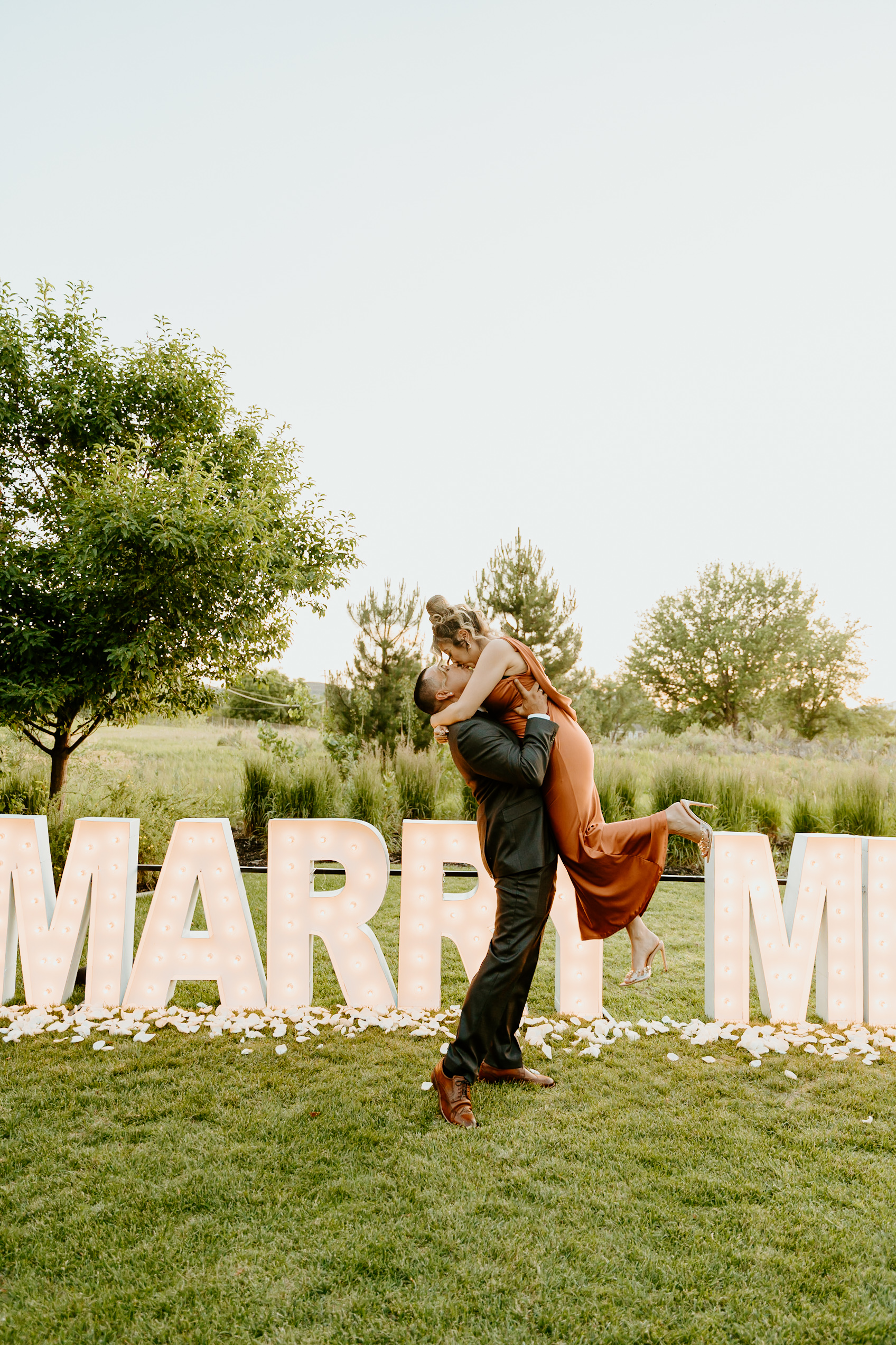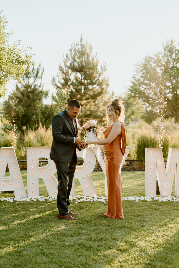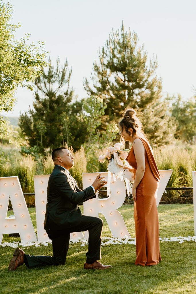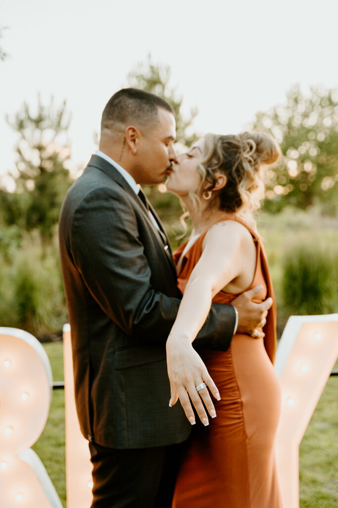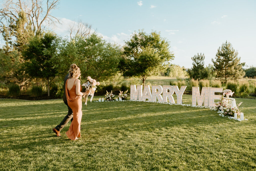 Elijah really wanted to WOW Breanna with this special moment. A beautiful private lawn in Brighton, Colorado, sets the perfect scene set for him to pop the question. He made sure all of her friends and family were there to witness such a special moment in their lives! The Marry Me Marquee Letter Proposal made for a moment they would all remember for the rest of their lives!