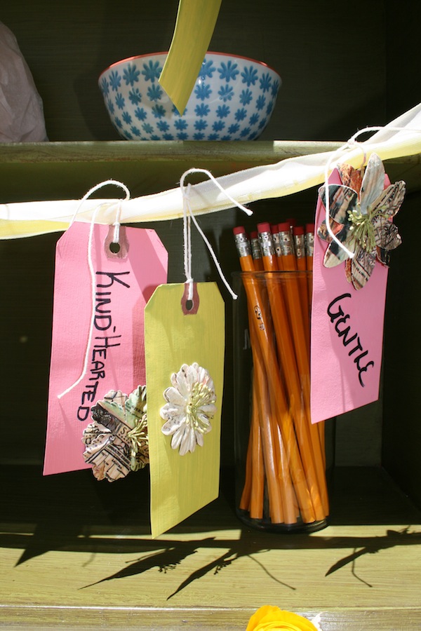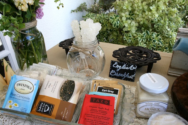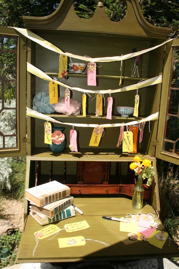 What I love most about designing showers is finding the details, big or small, that make it personal. Everything from the furniture to the rock candy stir sticks had Melissa’s name written all over it. We set up a make-shift photo shoot area in honor of the bride, a talented and aspiring photographer, for all the guests to enjoy and remember the afternoon. The green desk was a piece from my bedroom that was used for guests to write a word that best described Melissa. While we sipped tea and ate our yummy tea sandwiches, guests began to share the “word” they chose for Melissa which usually followed with an endearing and/or funny story.
