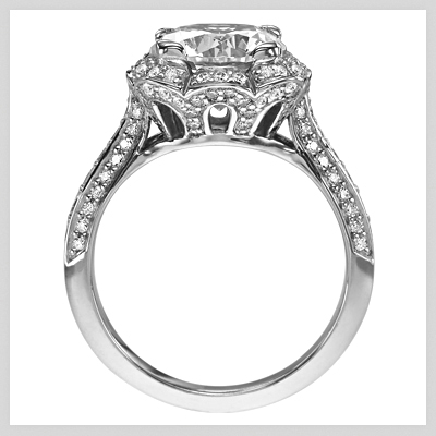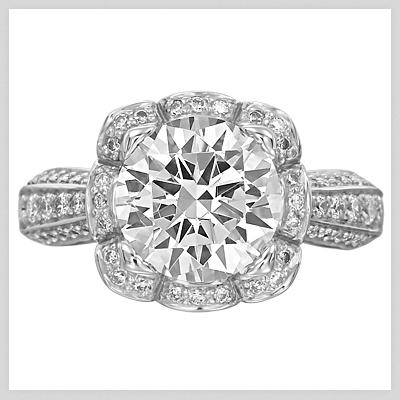 This Masterwork Engagement Ring, featured by Ritani, is so unique looking… you can’t help but stare! The Masterwork diamond engagement ring features a scalloped halo with a round cut centerstone. Micropavé diamonds surround the centerstone and are also on the mounting, and with graduated diamonds and two rows of pave diamonds on the shank. It’s available in Platinum, White Gold, Yellow Gold or Palladium. There’s just so much too look at!