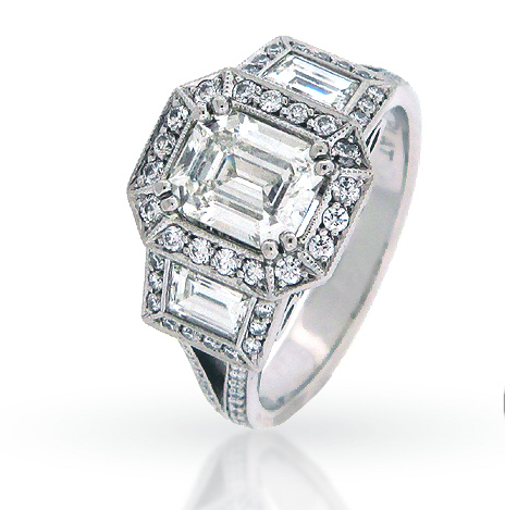 This beautiful Emerald Cut Halo Engagement ring caught my eye almost immediately, it might be because it is a little similar to my very own engagement ring. You can find this ring at Simone and Son, designer Jasmine Dakessian. This ring was made specifically for a previous customer of Simone and Son; featuring an emerald cut center diamond weiging 1.5 carats in platinum with 2 step cut trapezoid cut diamonds and pave set round brilliant cut diamonds. The coolest aspect to this ring is the personalized details within the ring. If you look close enough in the second image above, the “C’s” on the side of the ring represent the couple’s last initial. Not only can you design your ring to your desired perfection, but add significant meaning… so you’re sure no one else could have your exact same ring.