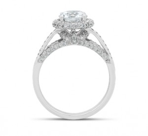 Simon G. 18k White Gold Halo Diamond Engagement Ring Semi- Mount. This piece features 119 small round diamonds. My favorite part is the mid-split shank band, not to mention all the little detail!