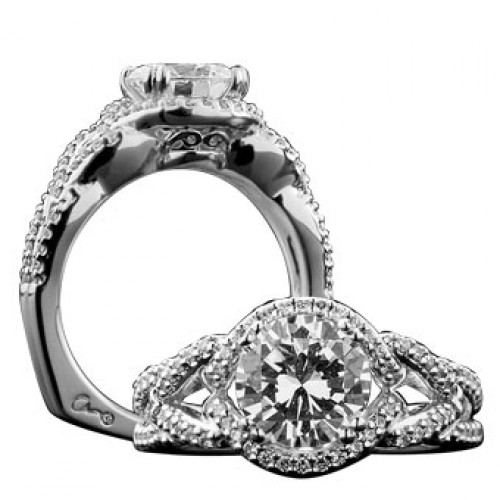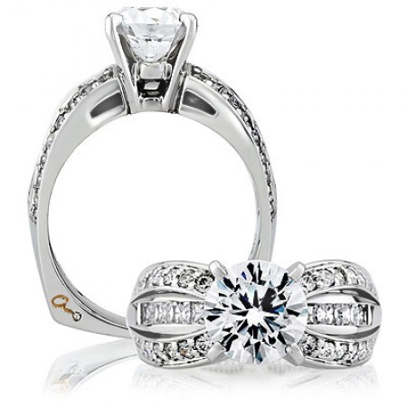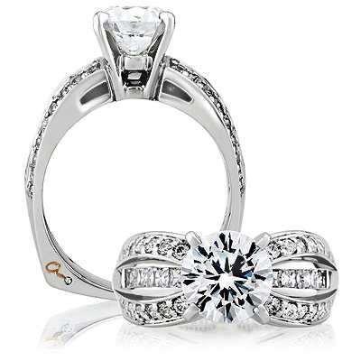 A. Jaffe diamond semi-mount engagement ring. Design shown with 5 carat center. Side diamonds total .33 carats and are VS clarity and G-H color. I love this ring because it’s simply… HUGE! It has a modest amount of detail but finishes with a big bang (a large center stone, that is)!!