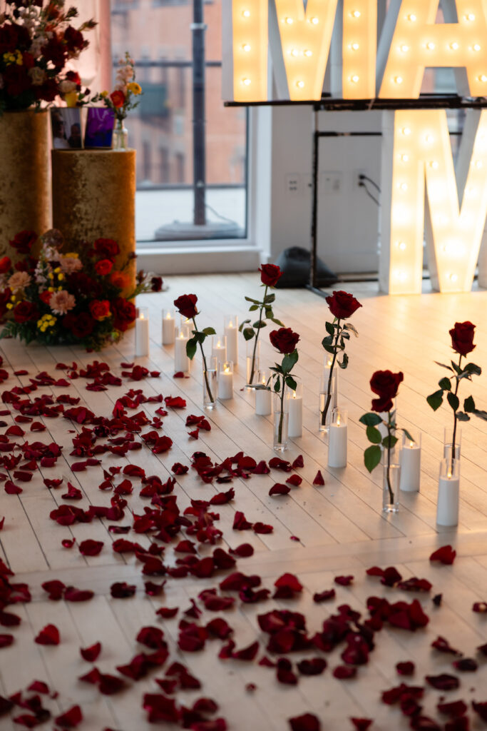 This custom-designed proposal in New Jersey featured a fully styled indoor setting, complete with cascading neutral drapery that created a soft and intimate backdrop. Paired with lush arrangements of red roses and seasonal blooms, the space felt both grand and deeply personal. The addition of warm candlelight lining the floor added a cozy, glowing ambiance that made the entire room feel like a private sanctuary designed just for them.
