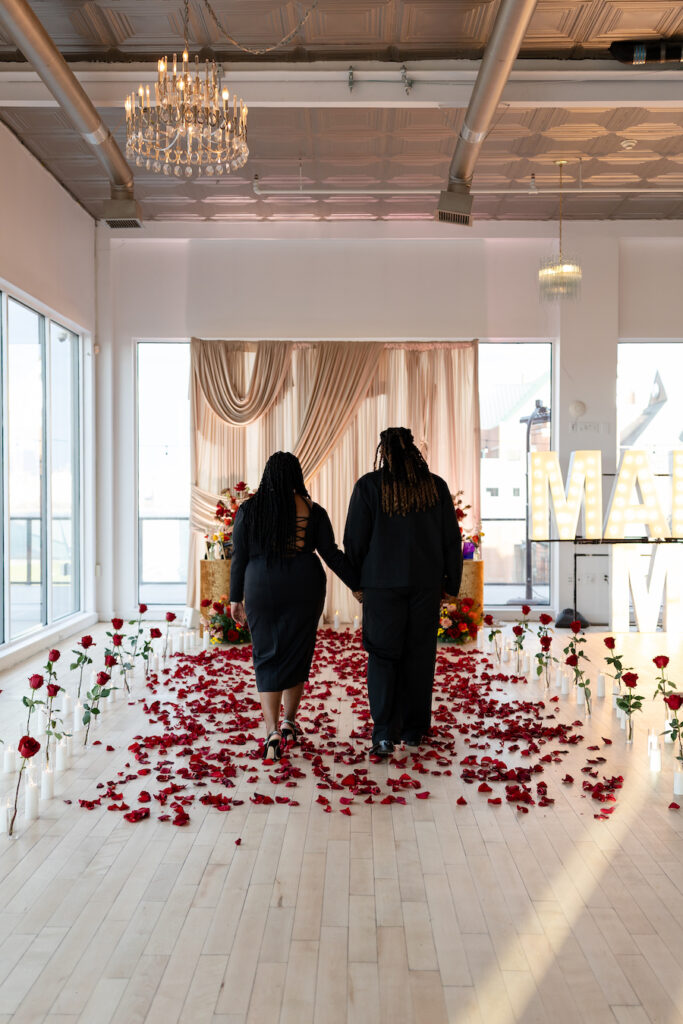As she stepped forward, petals scattered across the floor led her directly to the moment she would remember forever. With every detail thoughtfully placed, this New Jersey Luxury Proposal Set Up Package transformed a simple question into a cinematic and emotional experience. The contrast of the romantic red florals against the soft neutral draping created a visually stunning setting that felt straight out of a love story.