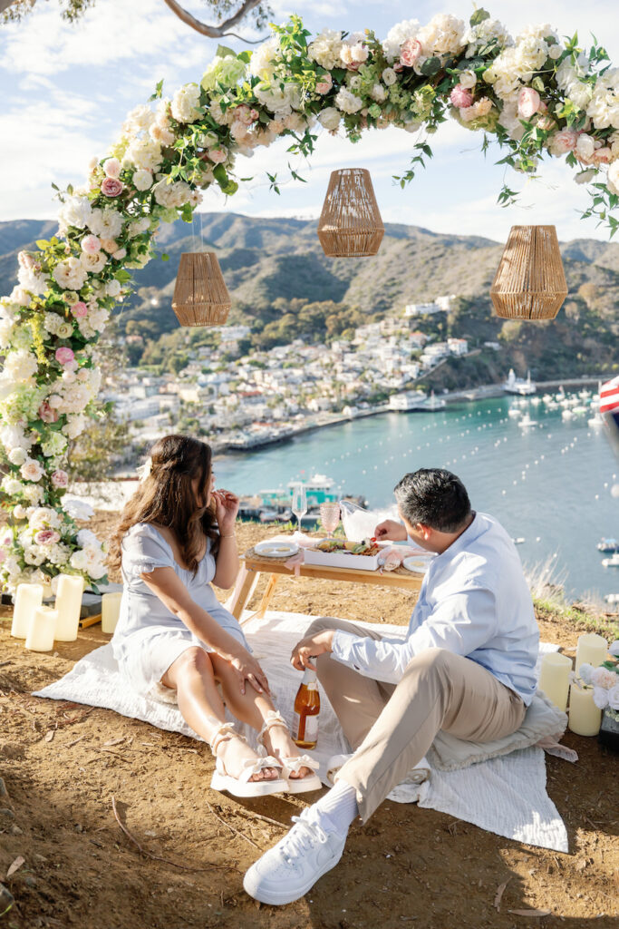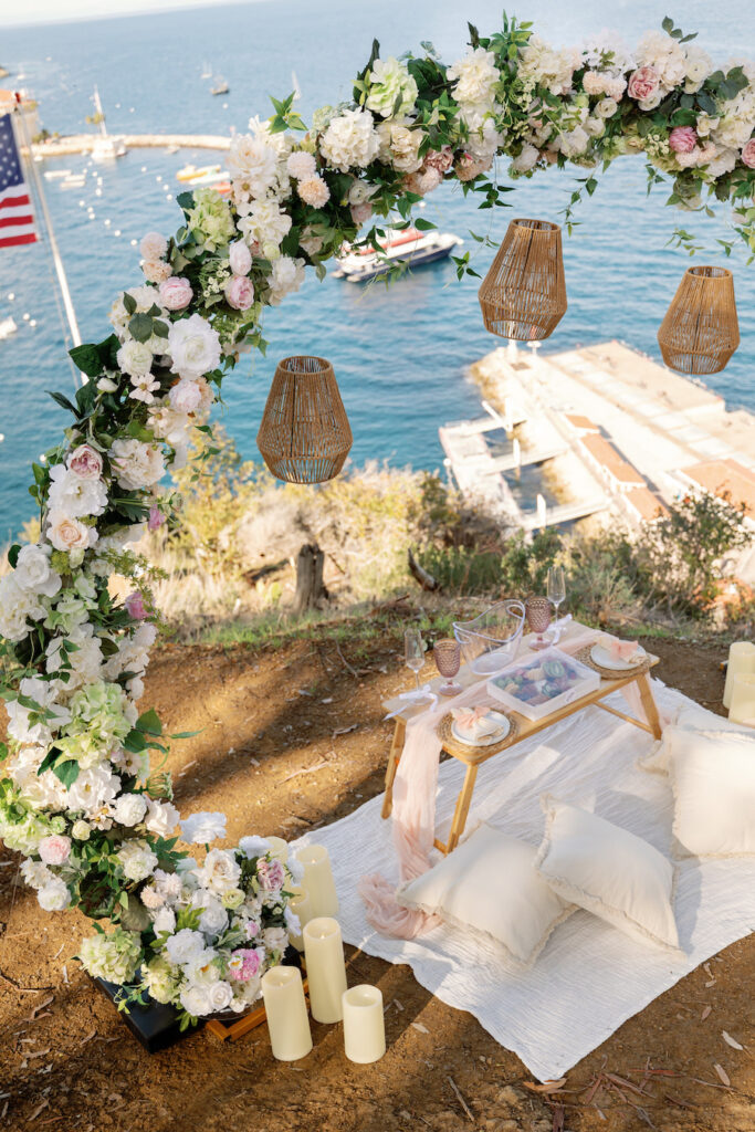 Our team designed a full romantic picnic set for two beneath a stunning floral arch—one of our lush, sustainable FAUX Ever Collection creations that we transported all the way to the island. This arch is one of our favorites for a reason: overflowing with soft blush and ivory blooms, it created a naturally romantic frame for the big moment while still allowing the iconic Catalina coastline to shine. Underneath it, we laid out a cozy blanket layered with soft textures, lanterns, and candles to complete the ambiance.