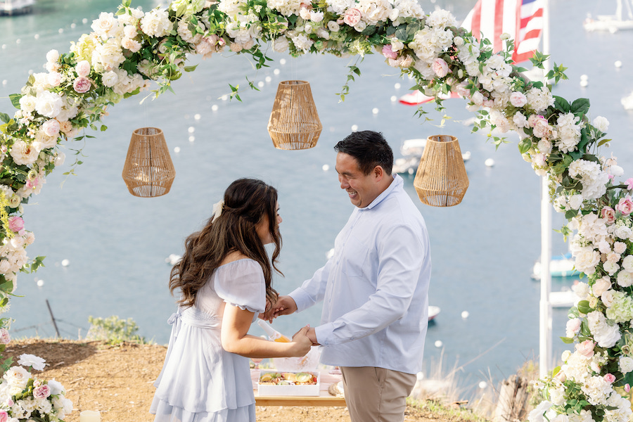 When he finally took her hand and led her under the arch, everything slowed down. They held each other close, soaking up the moment before he got down on one knee. It was tender, emotional, and absolutely filled with love—one of those proposals where you can feel the sincerity from across the space. Catalina Island truly delivered the perfect setting for their story.