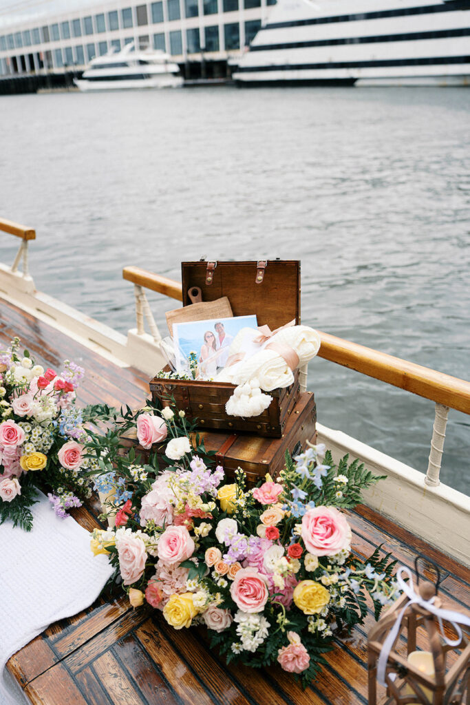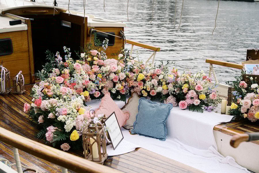Every inch of the boat was adorned with lush, colorful flowers—her absolute favorite. We designed a huge semi-circle floral arrangement that framed the deck, creating a dreamy, intimate space for the proposal. Cozy picnic-style pillows and blankets were arranged within the blooms, creating a soft, inviting atmosphere where the couple could relax and soak in the moment. The whimsical nautical touches, paired with a playful color palette, perfectly reflected her love for all things bright and joyful.