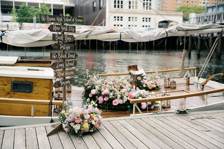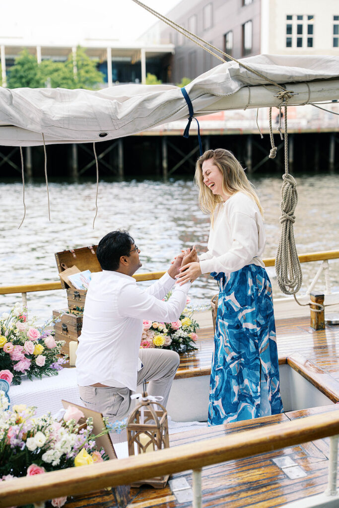 A private sailboat charter, a sea breeze in the Boston Harbor, and a proposal as vibrant as their love story – this unforgettable moment designed to reflect every special detail of their relationship. From the moment she stepped onto the boat, she knew something extraordinary was about to happen. He had told her they were going on a fun adventure together for the day, but the colorful florals, custom signs, and intricate setup gave away that this was more than just a casual outing.