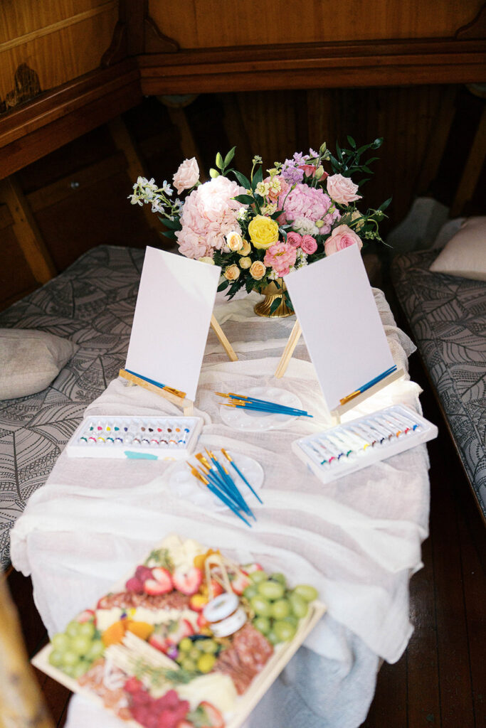 But the surprises didn’t end there! To create a full day of memories, we included a “paint and sip for two” setup onboard, allowing them to create their own masterpiece while cruising through the harbor. With a delicious charcuterie board, champagne, and a creative activity to enjoy together, they spent the rest of their evening laughing, painting, and celebrating their engagement in a unique and playful way that felt authentically them.