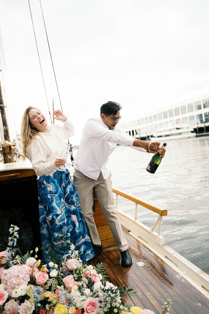 As they explored the boat together, taking in the colorful blooms and thoughtful details, the moment finally arrived. Surrounded by beauty, he got down on one knee. Her reaction was priceless—overwhelmed with excitement and joy, she couldn’t stop laughing and smiling as she said yes. The ring, absolutely stunning, added even more sparkle to the day, and they celebrated the moment with a champagne toast and a cozy cuddle within their floral oasis.