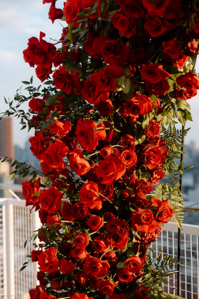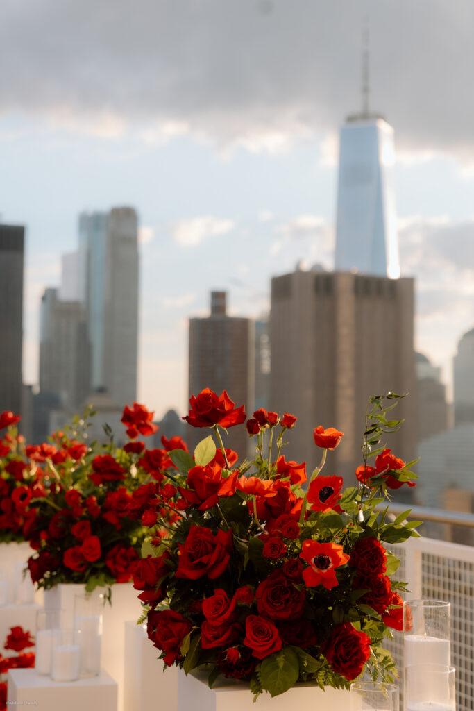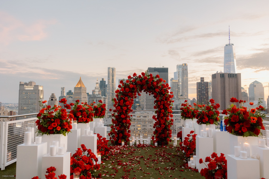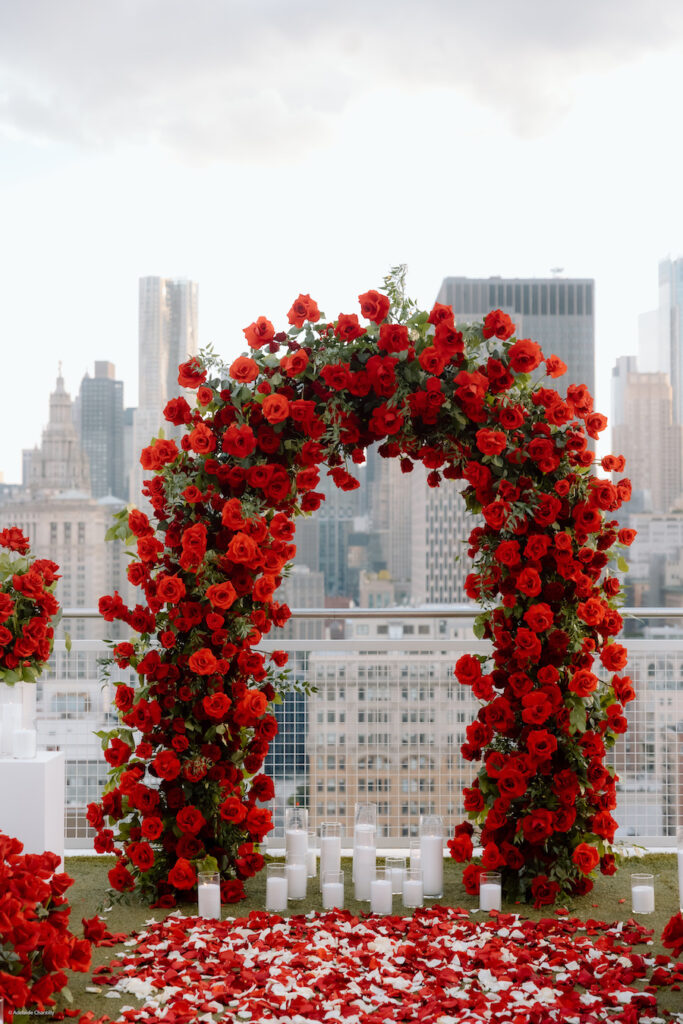 Every detail came together beautifully, especially the grand aisleway lined with red roses, glowing candles, and scattered petals. Towering modern white pillars held lush floral arrangements that added height and drama, guiding the couple toward the arch and the moment that would change their lives. For couples searching for a red rose aisle proposal, NYC rooftop candlelit proposal, or romantic red floral engagement setup, this is the kind of breathtaking inspiration that defines luxury proposal planning.