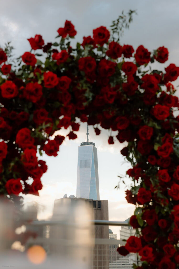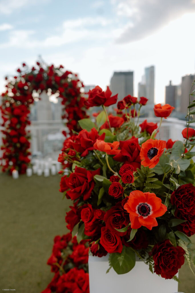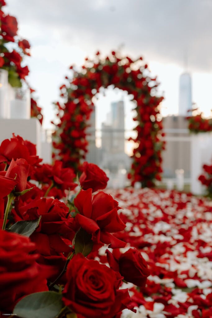 Perched high above the city with unbeatable skyline views, the venue was transformed into a floral wonderland. A lush red rose arch framed the iconic skyline, while hundreds of roses and cascading petals lined the aisle to create a dramatic and romantic walkway. White pedestals topped with glowing candles added height and sophistication, bringing the entire vision to life.