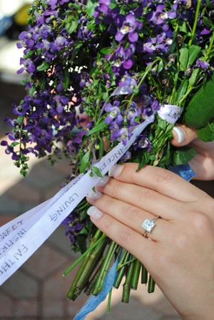 The moment I heard the first note, my heart started racing, and I knew exactly what was about to happen. They began to sing a song that has been special to me and Matt ever since we heard it together on a date during our senior year of high school. As they sang the lyrics “Roses are red my love, violets are blue,” Matt’s mom handed him a bouquet of roses and his sister handed him a bouquet of beautiful violet flowers, each wrapped with ribbons that Matt adorned with words that he felt described me. As they sang the last part of the chorus, “sugar is sweet my love, but not as sweet as you,” Matt got down on one knee, and his father handed him a sugar bowl which contained the most beautiful engagement ring. Matt proposed to me with the sweetest words I have ever heard, and I couldn’t wait to say YES!