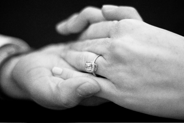 Heather- Engaged May 2008. The center stone is a princess cut diamond. It’s an antique halo setting, with 2 side trapezoid diamonds, pave diamonds on all sides creating an unique design (her favorite part!), finished with diamonds covering the band from Benjamin & Co Fine Jewelry.